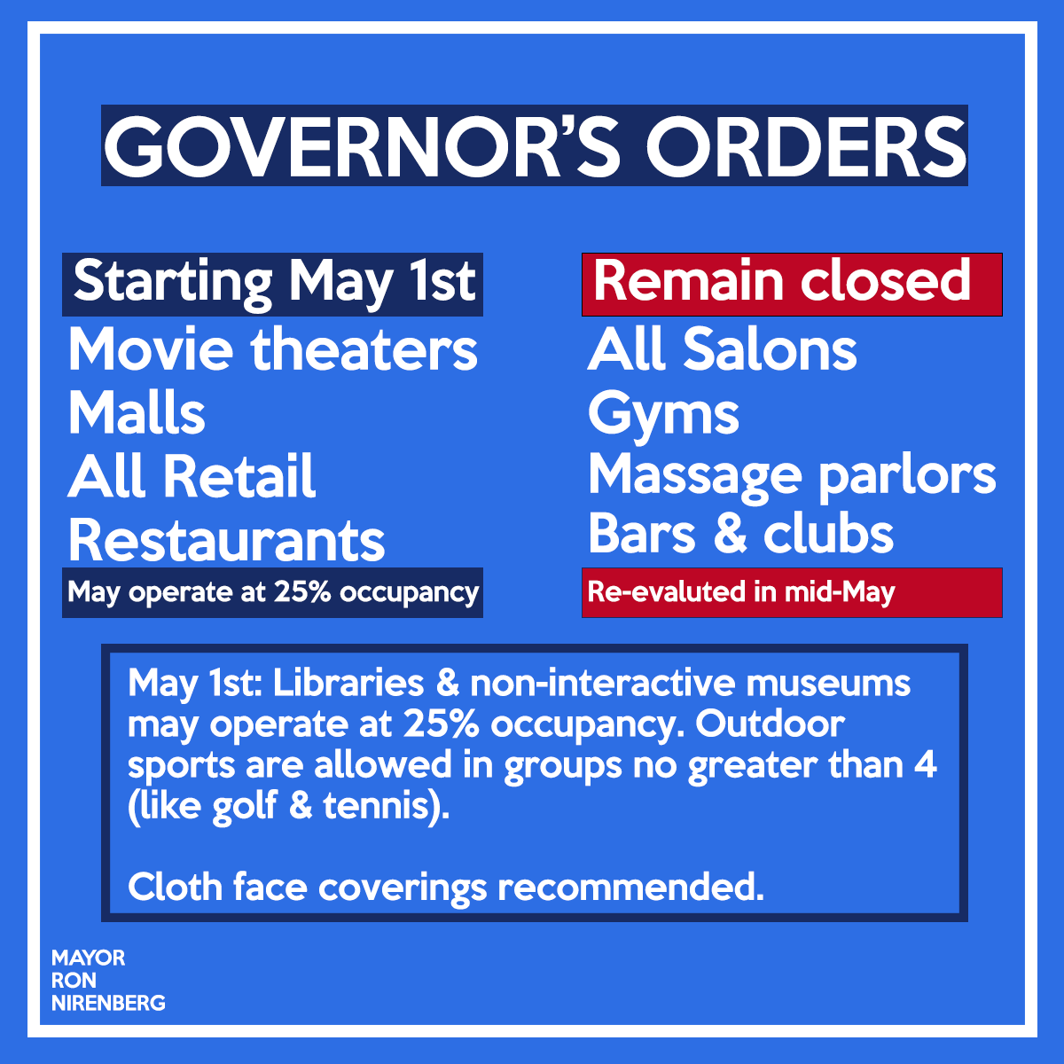 Movie theaters, malls, all retail and restaurants may open May 1 and operate 25% max. occupancy.