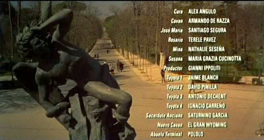 El Ángel Caído apareció en la película satánica por excelencia del cine español, EL DÍA DE LA BESTIA, en primer plano en los créditos, mientras el Padre Berriatúa y Cavan se alejan por el Retiro, iniciando un sello de autor de Álex de la Iglesia con los monumentos de Madrid.