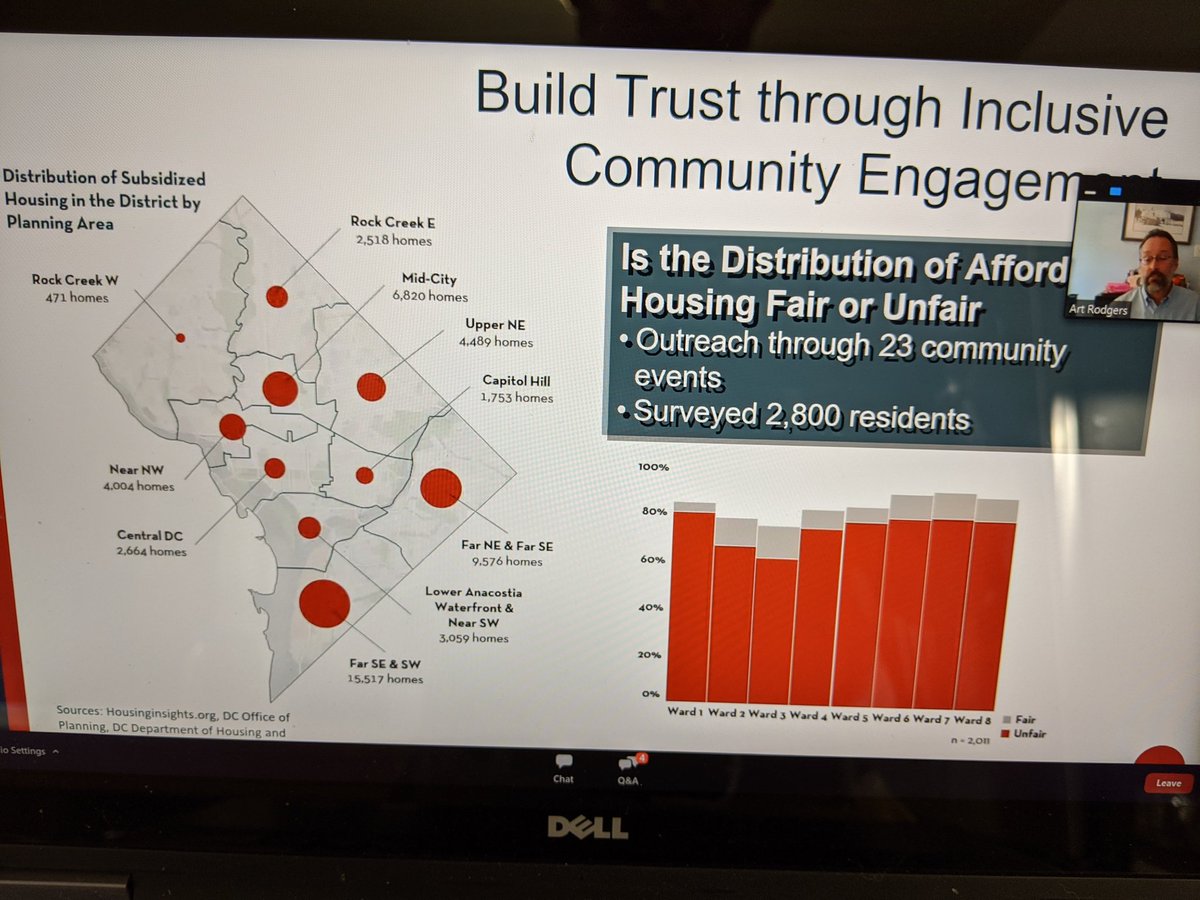 Art Rodgers, planner for DC, is talking about great engaging the community around the status quo and history of housing and zoning in the city. Got to a consensus in all parts of the city that the distribution of low-income housing was unfair