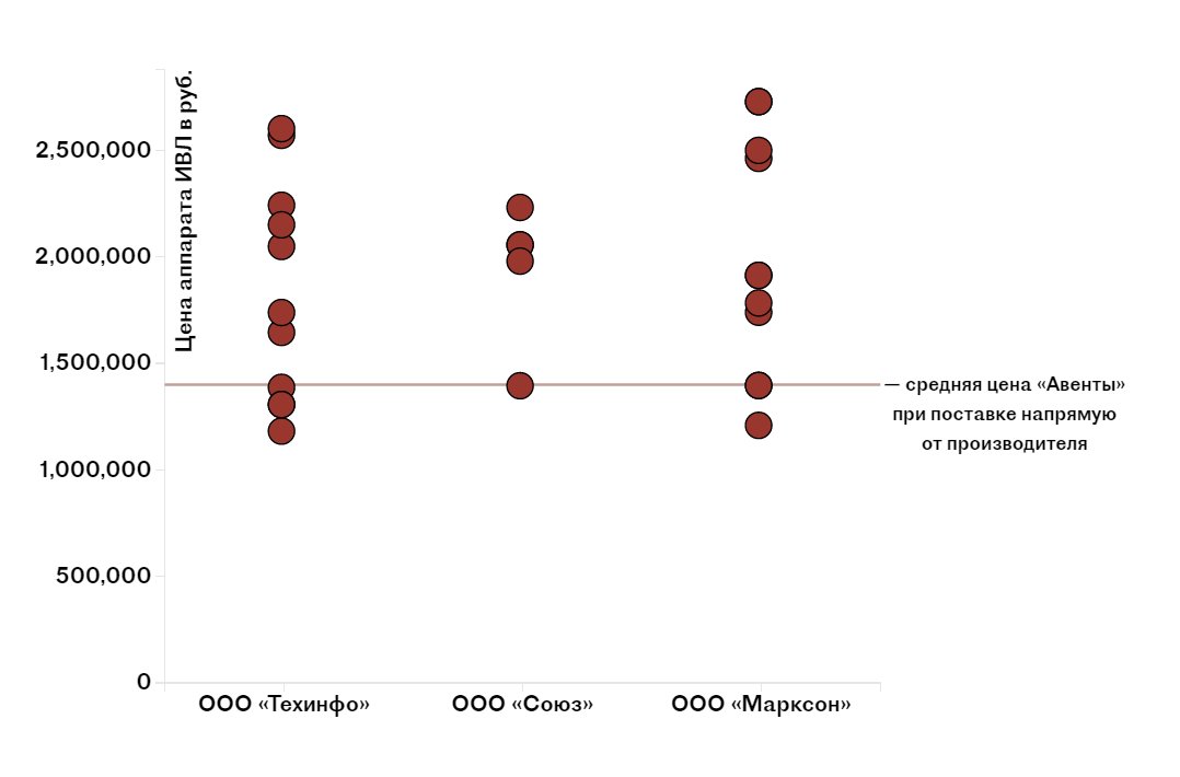 Точкой отмечены цены на один аппарат ИВЛ по контракту. Во многих случаях больницы покупали отечественные аппараты ИВЛ по цене зарубежных более высокого класса