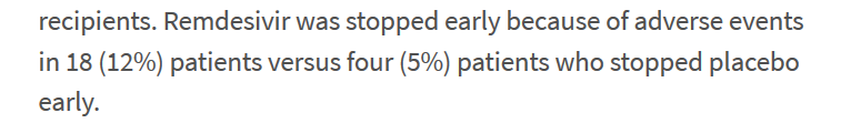 25/n L'étude faite en Chine sur le remdesivir, qui a été arrêtée faute de recrutement, ne montrait pas non plus de résultats positifs. Elle montrait aussi 12% d'abandons précoces en raison des effets indésirables du remdesivir thelancet.com/journals/lance…