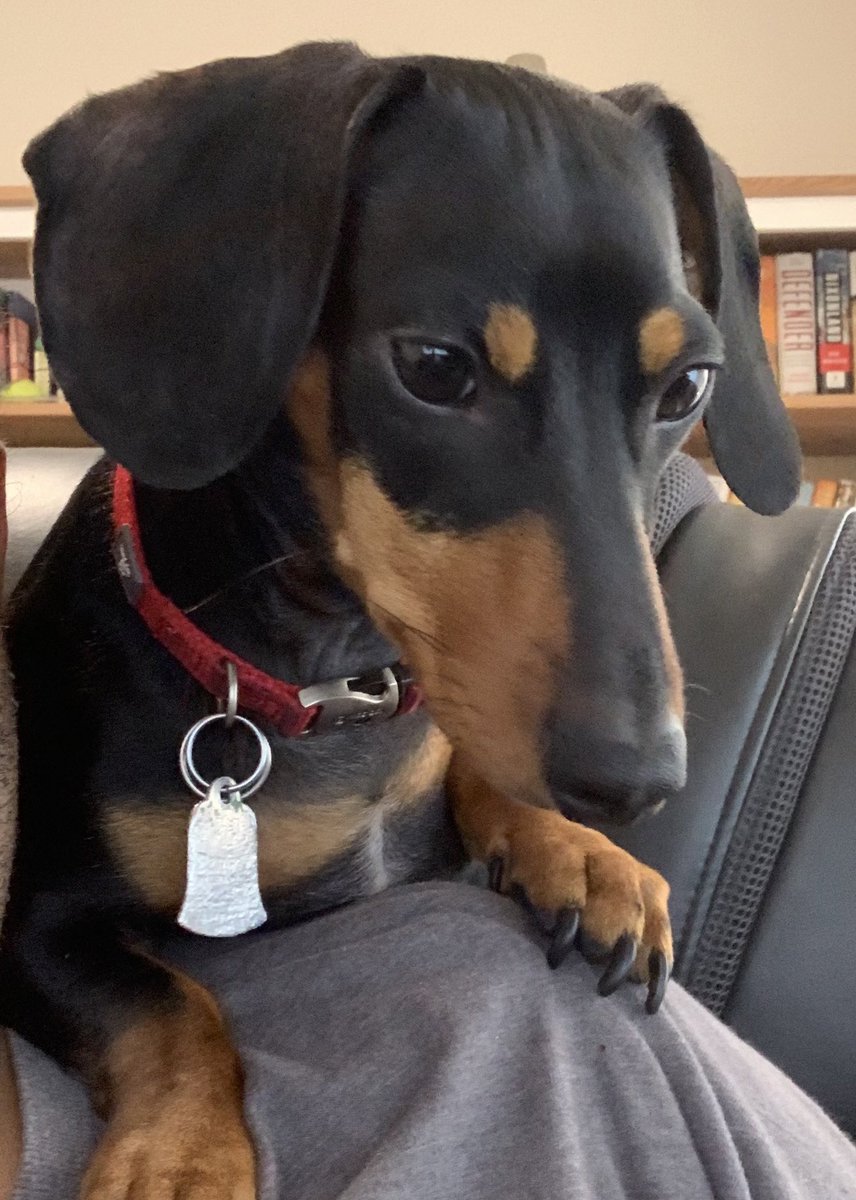 Kal-El has the run of the house. He can go anywhere he wants. So where does he decide to take the bully stick for a major chew session? My knee. Thanks.