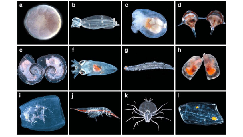 Jenis makanan bagi hidupan yang menetap di zon mesopelagik, terdiri daripada makanan yang rendah kandungan tenaga. Misalnya seperti cebisan organik, najis ikan dan mamalia, atau cebisan bangkai haiwan zon epipelagik yang jatuh.