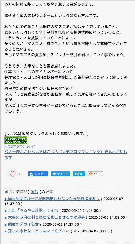 マスゴミと共産党がなぜか主張が一致して反対を騒いできたのもそうですが、マスゴミと共産党の主張が一致しているときは100%疑ってかかるべきでしょう〉