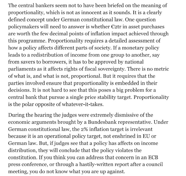 Comme le rappelle @Eurobriefing, le principe de proportionnalité exige de démontrer qu’acheter plus de 2400 Md€ de titres publics est nécessaire pour atteindre la stabilité des prix et qu’il n’existe pas d’autres outils avec un rapport bénéfices/risques plus satisfaisant.