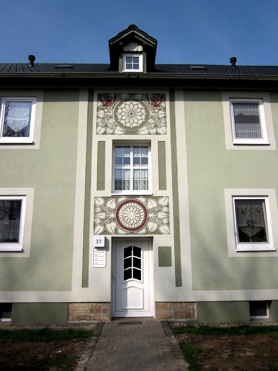 Here is gorgeous worker housing built in rammed earth in 1955 in Mücheln, Saxony-Anhalt with very muscular DDR mural art. Perfect condition but the apartment windows look very new (ugly, unfitting, compare with the staircase windows in the middle).