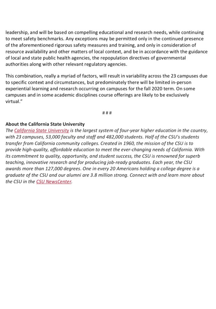 Statement from @calstate Chancellor Timothy White... sounds like the only exceptions for in person teaching this fall will be labs for science/health/math based classes.
