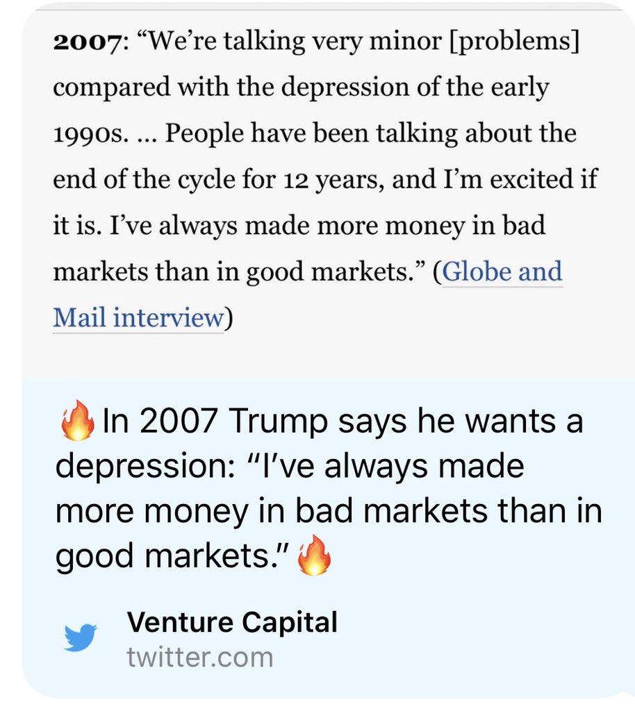 💥@realDonaldTrump,a so-called rich guy, LOVES bad markets. “I’ve always made more money in bad markets than good markets.” 2007