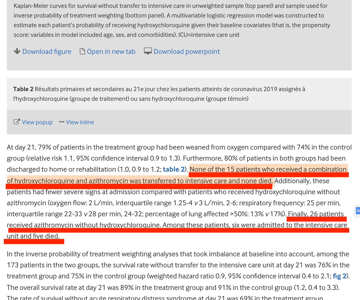 26 patients ont reçu de l'azithromycine SANS HCQ. Parmi eux, six ont été admis à l'unité de soins intensifs et cinq sont décédés.