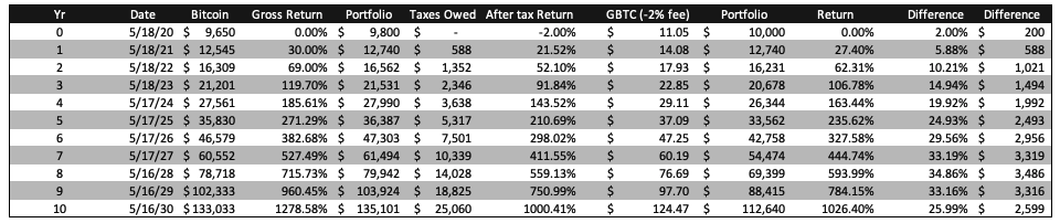 With the above assumptions, $GBTC would have better after tax returns after 10yrs. But the returns are highly dependent on the assumptions. Also, if we assume that the premium to $BTC drops to zero, this outperformance is pretty much none.