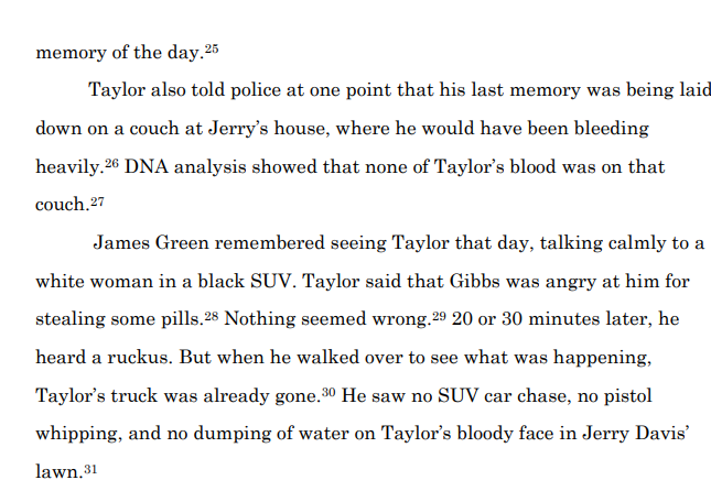 How could he have no defensive wounds or marks on his hands if Gibbs had "pistol-whipped" him? /8