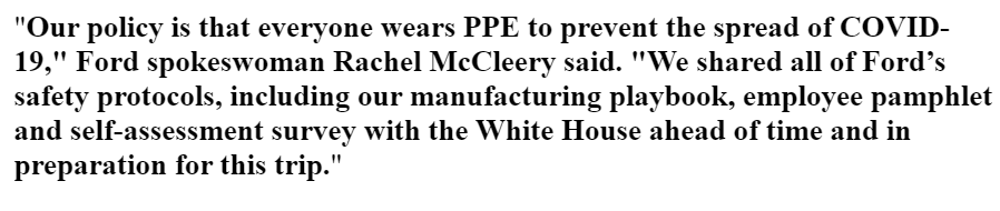 A Ford spox follows up with @weijia: “As we have said previously, we shared our safety policies and recommendations with the White House in advance of this visit. The White House has its own safety and testing policies in place and will make its own determination.”
