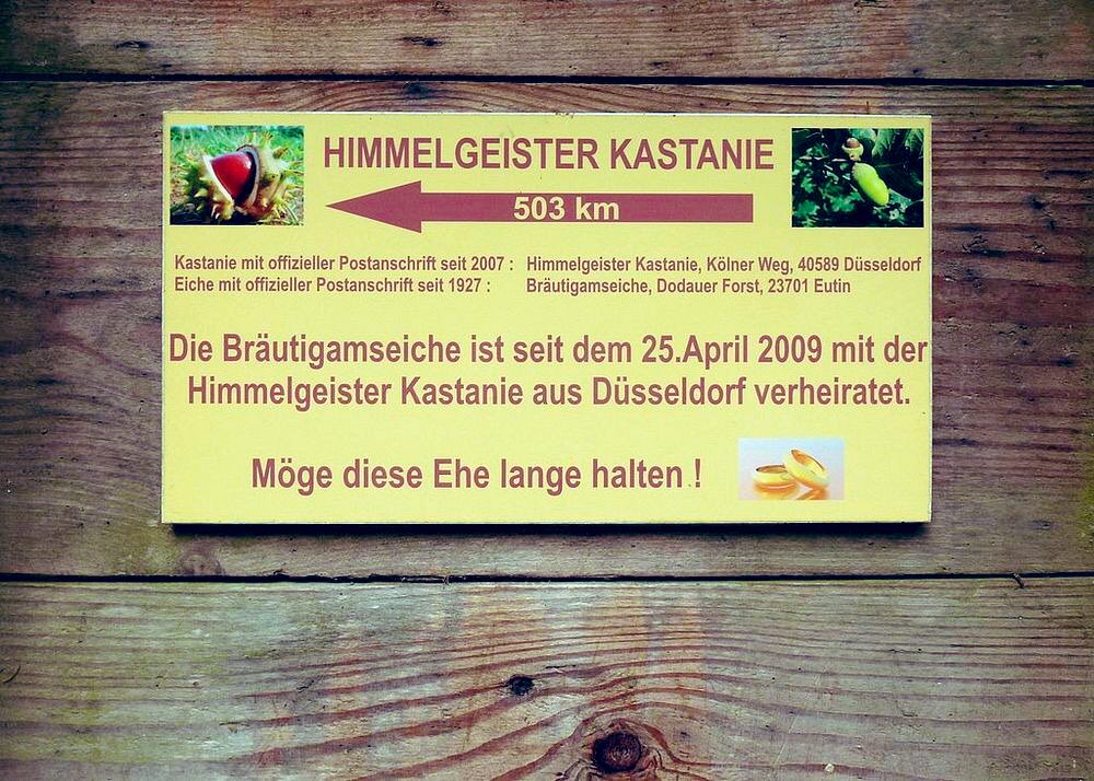 2009’da meşe ile Düsseldorf’taki tarihi bir kestane ağacı evlendirildi. Aralarında 503 km olsa da aynı tarih ve saatte ağaçların altında buluşanlar evliliği kutladılar. Ancak evlilikleri 6 yıl sürdü. Kestane artık yaşamıyordu. Dalları budandı ve gövdesine bir kız figürü işlendi.