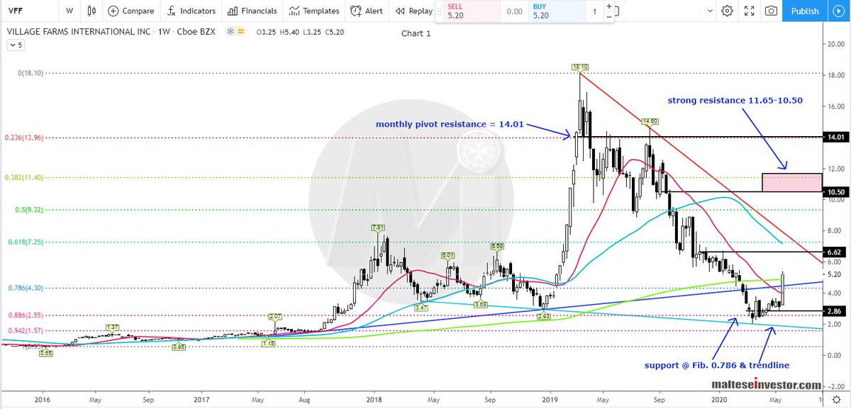Weekly Chart: Since peaking at an all time high of 18.10 price has declined steeply finding #support at the #Fib. 0.786 at 4.30 and #trendline 2.07. Price has broken above the SMA 200 and the 2017 trendline has been temporarily .....