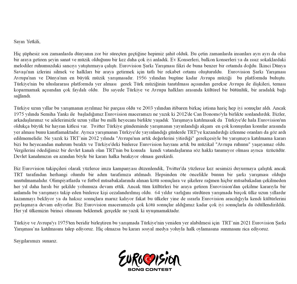 Türkiye ve Avrupa'yı 1975'ten beridir birleştiren bu yarışmada Türkiye'nin yeniden yer alabilmesi için TRT’nin 2021 Eurovision Şarkı Yarışması’na katılmasını talep ediyoruz.