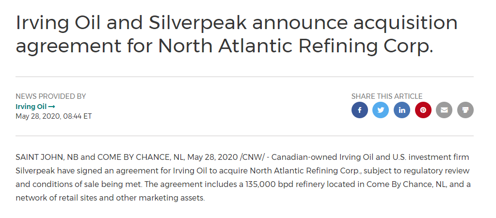 Irving Oil is buying the refinery in Come By Chance, NL, along with a heap of other North Atlantic Refining Corp. assets. #oott#oilandgas