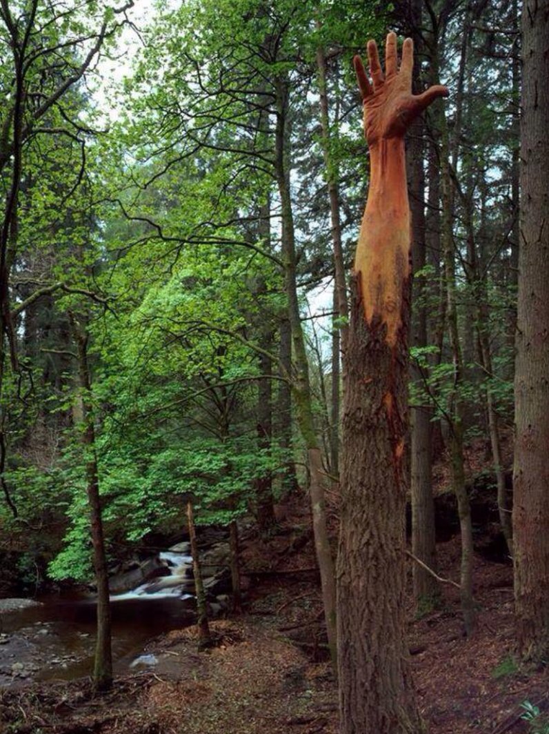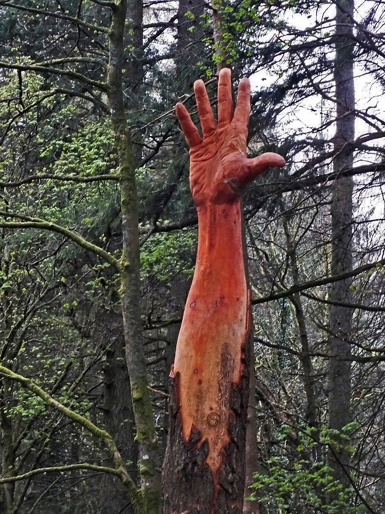 This is the Giant Hand of Vyrnwy, a wonderful folk horror-like work of art which lurks deep in the Welsh woodland.