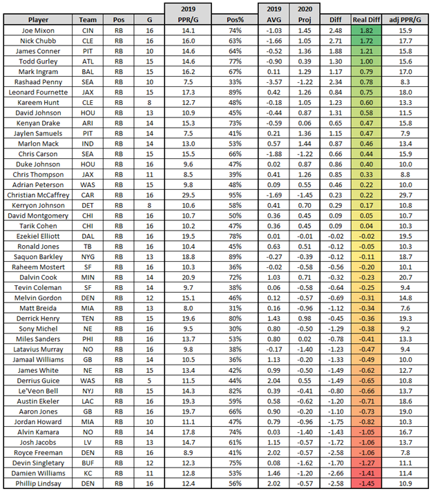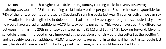 The difference between Joe Mixon’s schedule last year and his schedule this year is the difference between him finishing 20th (14.1) and 12th in fantasy points per game (15.9).