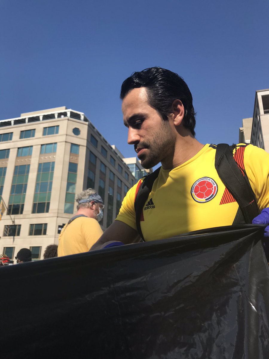 Plastic bottle, clothing, protest signs, even an apple are strewn on Pennsylvania Avenue, behind the police line.