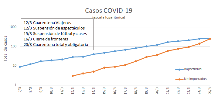 La curva Importados (celeste) baja desde el 21/3 y oscila por repatriados con cuarentena (desde 8/3) y fronteras cerradas (16/3) y cae cada vez más, como es de esperar.