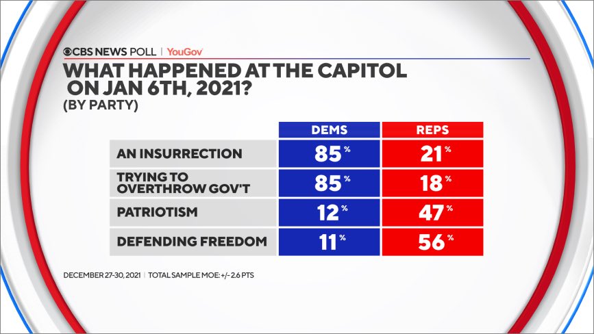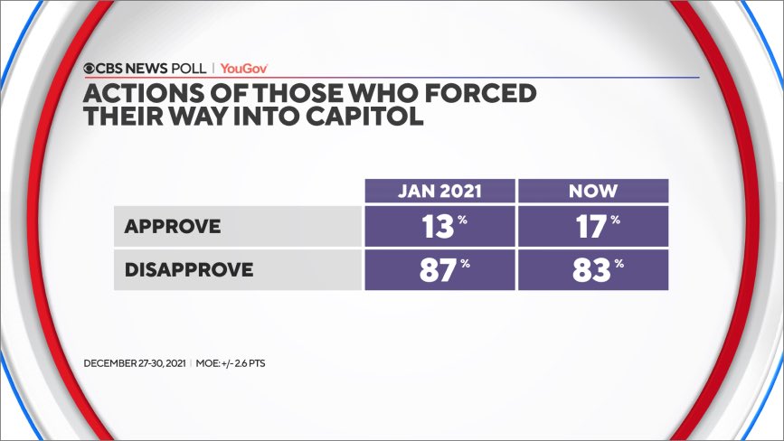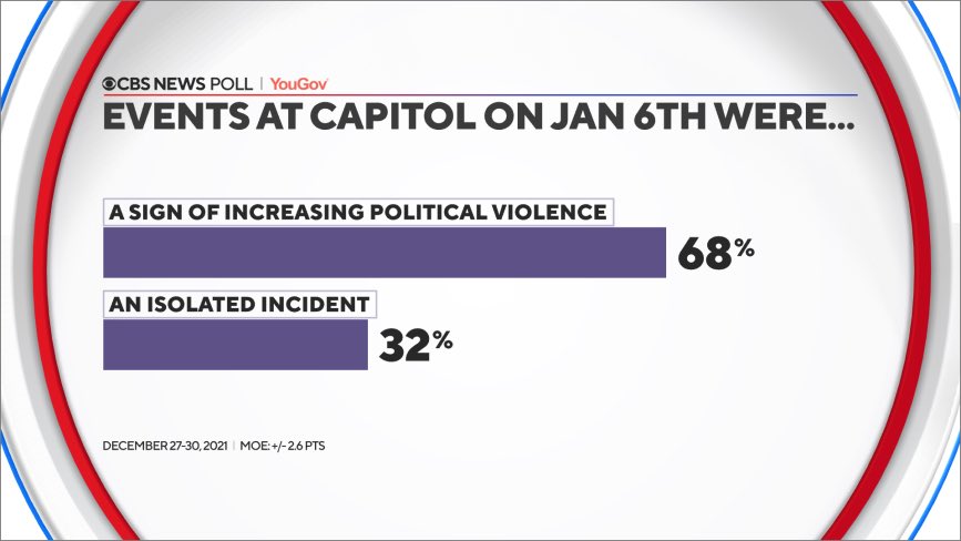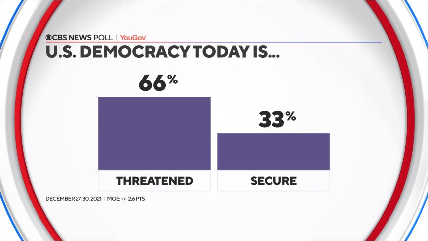 NEW FROM @CBSNewsPoll: January 6 has had lasting impacts on the nation's psyche, the most immediate of which is that millions of Americans think more violence is coming, and that democracy itself might be threatened. (A thread…)