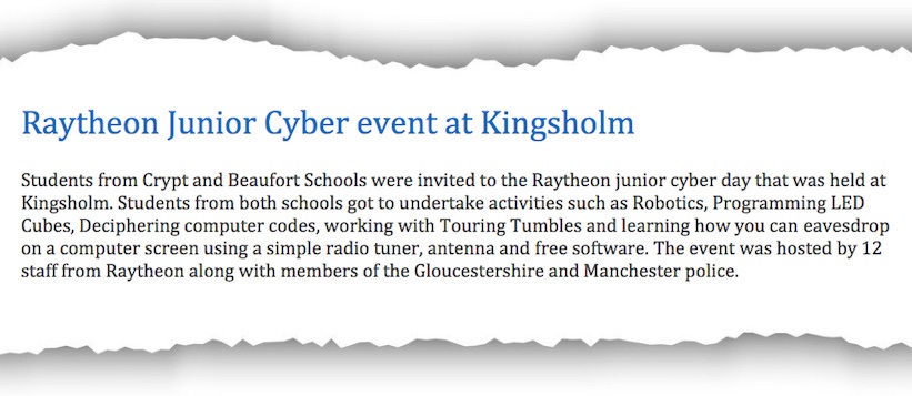 We saw evidence that GCHQ facilitated the entry of arms corporation Raytheon into a *primary school* to teach children “how you can eavesdrop on a computer screen using a simple radio tuner”.