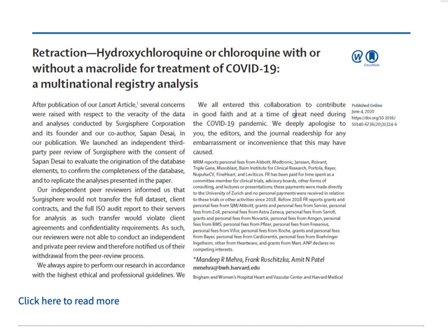 Now @TheLancet retracts Mehra article on HCQ… question will be… what can we learn from the failure of peer review. And how can we improve #bigdata science. And what exactly happened here? thelancet.com/lancet/article…