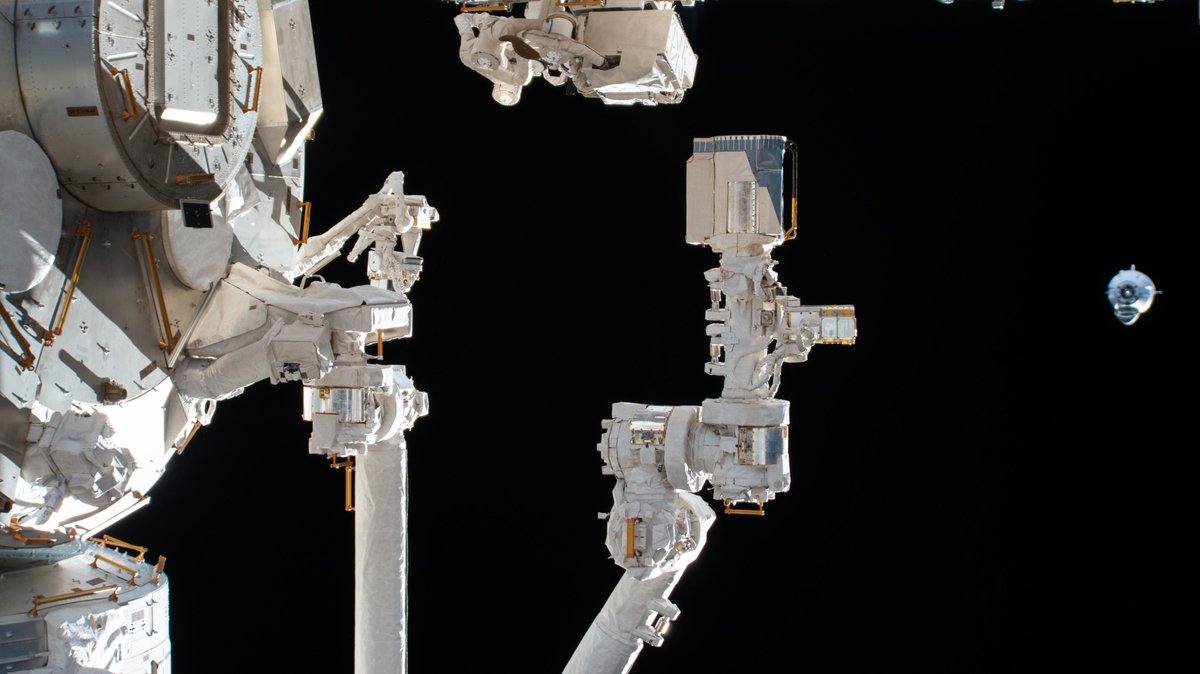 y los astronautas se encontraron en la ISS con sus colegas al otro lado de la esclusa.