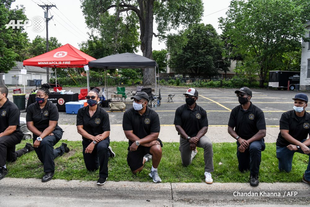 Pallbearers move the casket containing the remains of George Floyd after a memorial service in his honour in Minneapolis, Minnesota. Minneapolis fire department officers kneel as the hearse drives past