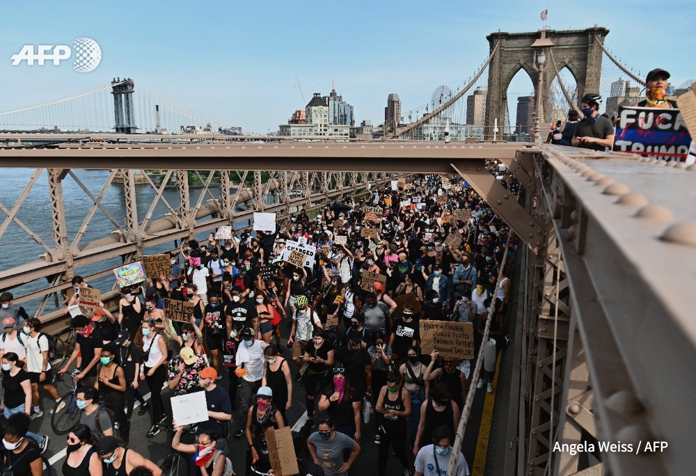 Thousands of protesters march over the Brooklyn Bridge in New York to demonstrate against the death of George Floyd