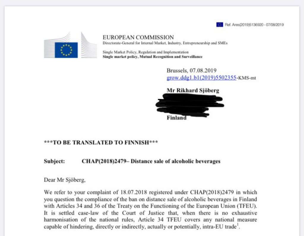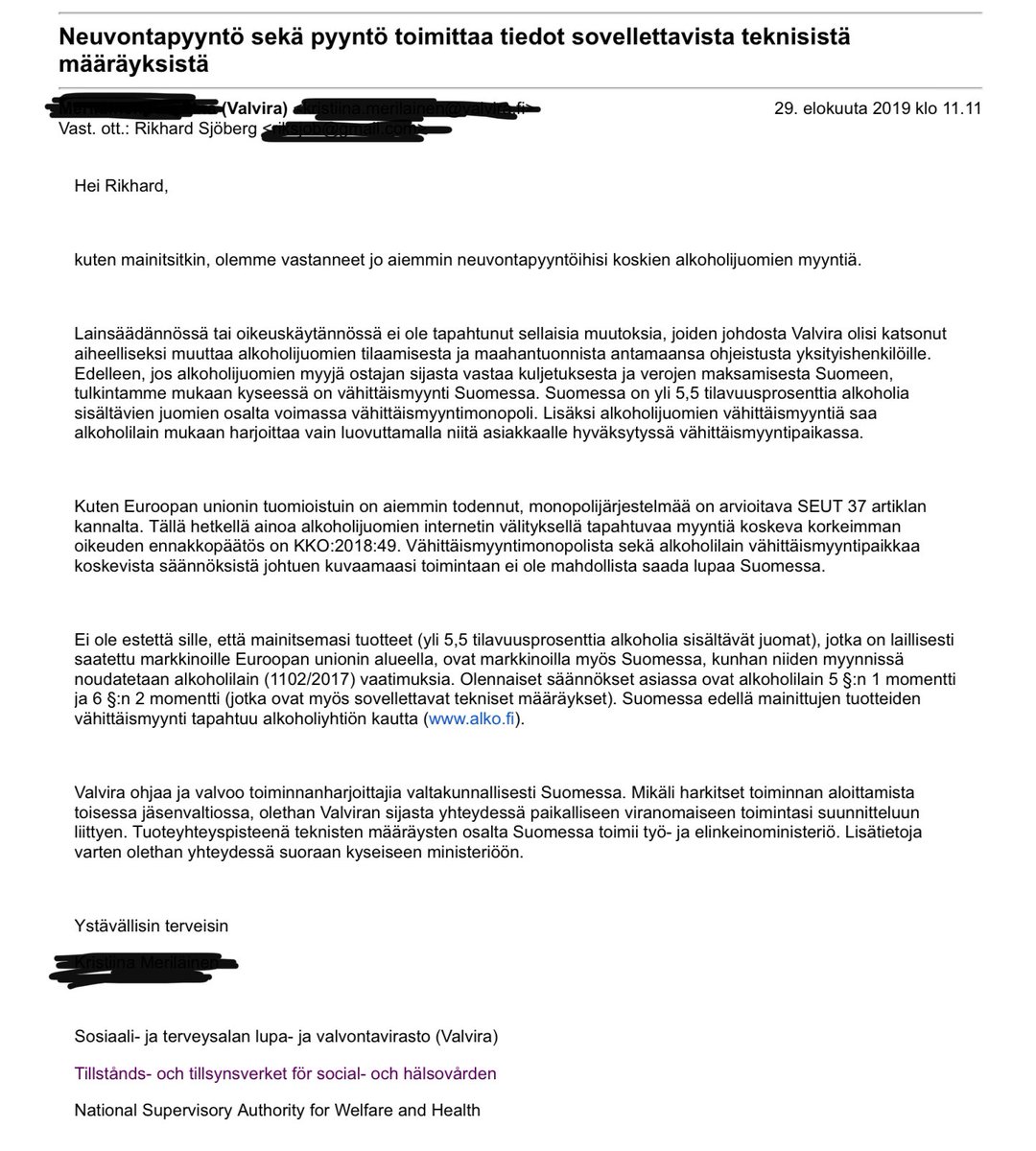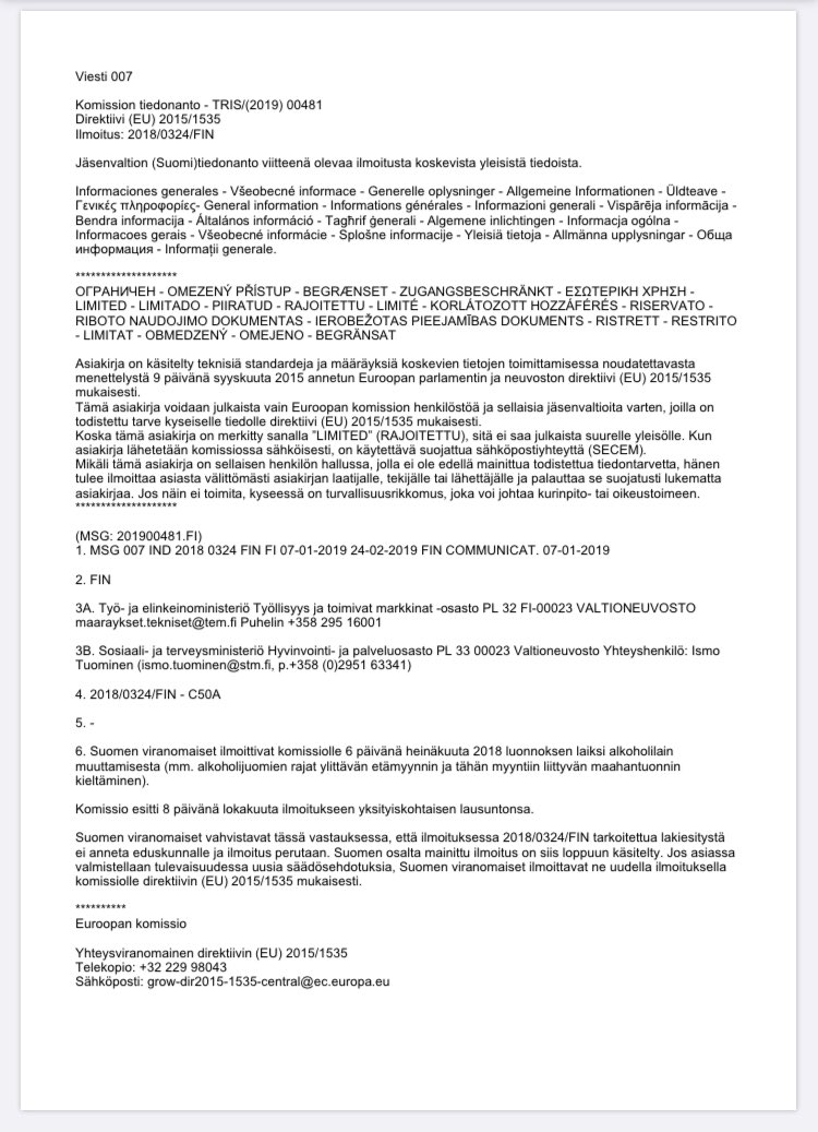 Suomi ilmoitti komissiolle helmikuussa 2019, että etämyyntikieltoehdotus perutaan eikä lakia säädetä. TRIS-menettely suljettiin. (10/n)
