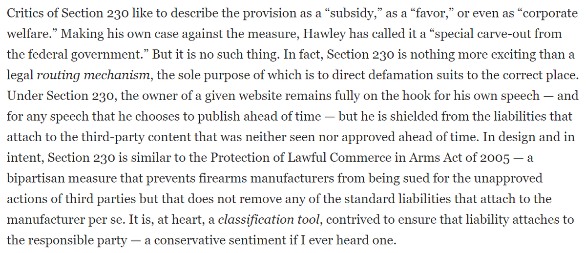 As @charlescwcooke notes, 230 IS tort reform—and solidly conservative. Read the piece that prompted Hawley's rant