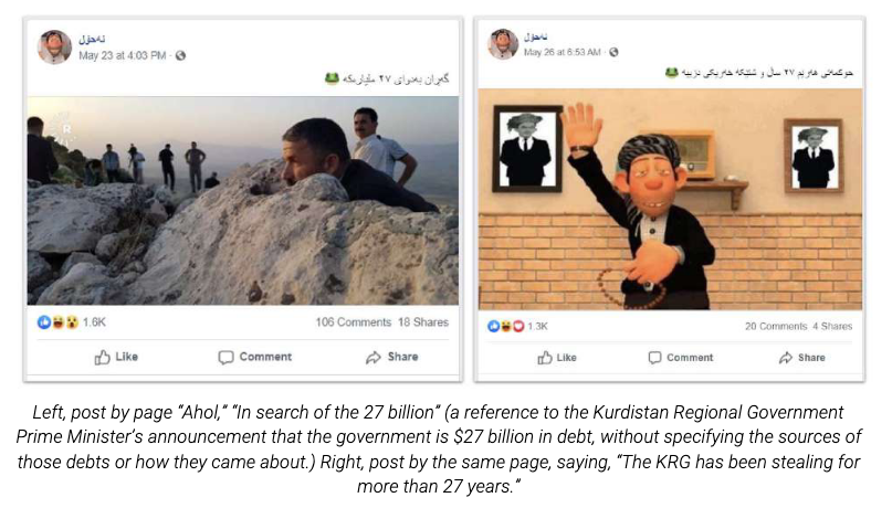 The accounts "typically supported the Kurdish political party the Patriotic Union of Kurdistan (PUK) & its co-leader Lahur “Sheikh Jangi” Talabani & criticized the governing Kurdistan Democratic Party (KDP) & its leaders from the Barzani family"