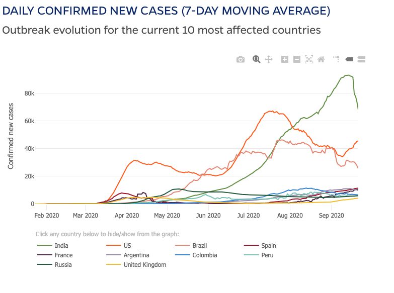 The US saw a decline until mid-Sept or so. Is that because schools re-opened? Colleges? Not clear from this graph. Is this the 3rd wave? Interesting that India locked down and cases dropped quickly. The US, not so fast.