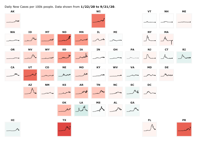 These are the state counts. The Dakotas are seeing increases, as are Wisconsin, Puerto Rico and Utah. Perhaps most notable is the upswing in Texas, which had seemed to have gotten the outbreak under control. That may have been a premature assessment, though.