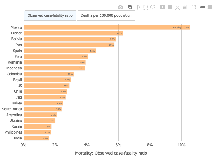 These are the case-fatality rates in different countries. The US is in the middle of the pack. Some of the countries, like India, have lower rates simply because they have younger populations with fewer co-morbidities and lower risk of death if infected.