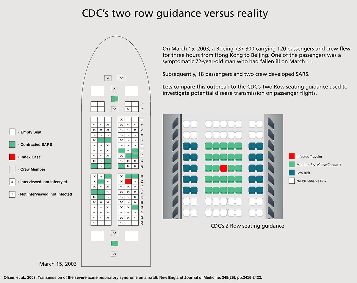 Neem deze vlucht op 15 maart 2003. Eén symptomatische SARS-patiënt besmette 20 anderen. De verspreiding hield zich, op z’n zachtst gezegd, niet aan de tweerijenregel.