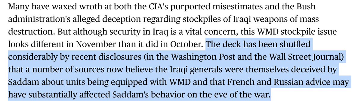 I've seen some claim, in defending the architects of the Iraq War, that Saddam's goal was to fool everyone, including his generals, into believing he had WMDs, the implication being you can't fault Bush for also getting this wrong. This is simply PR spin from war supporters. 1/n