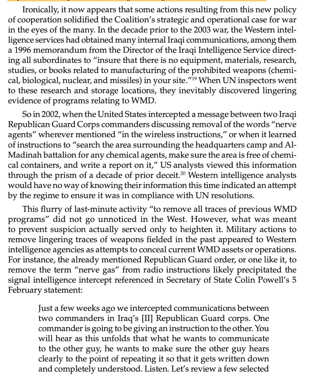 Attempts to remove all traces of WMDs were treated as evidence the regime still had them by a US intelligence community that was facing pressure from the top to justify war. 4/n