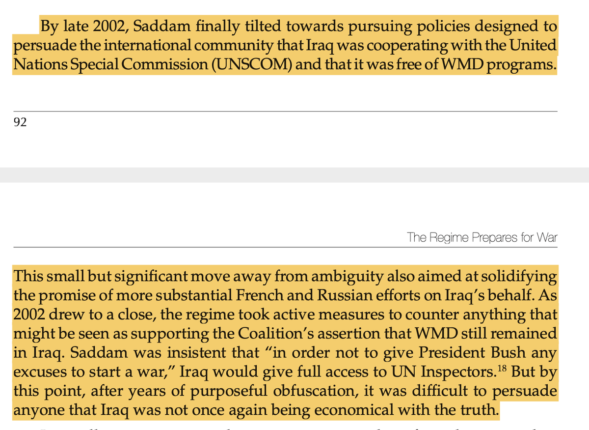 In sum, there was no conscious plan from Saddam to fool members of his regime. He tried to maintain ambiguity towards the outside world, but that ended in 2002, at which point he did everything he could to comply with weapons inspectors and avoid getting deposed. 7/n