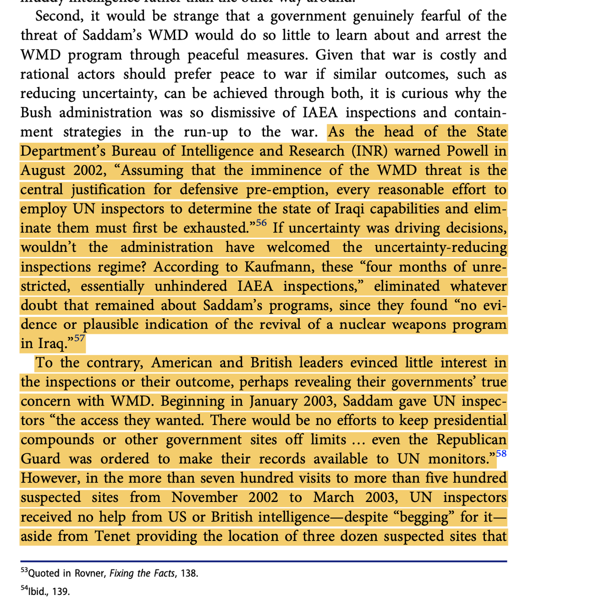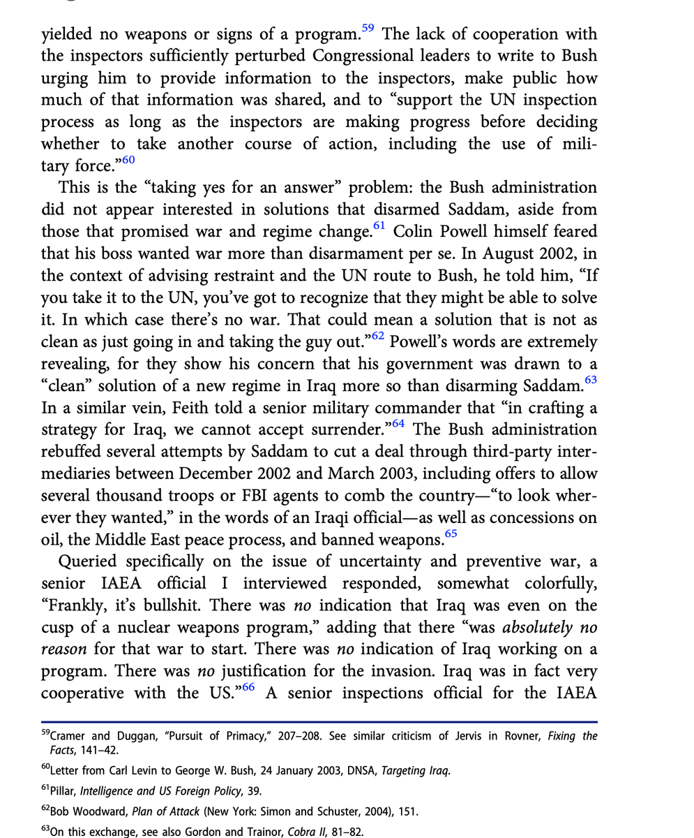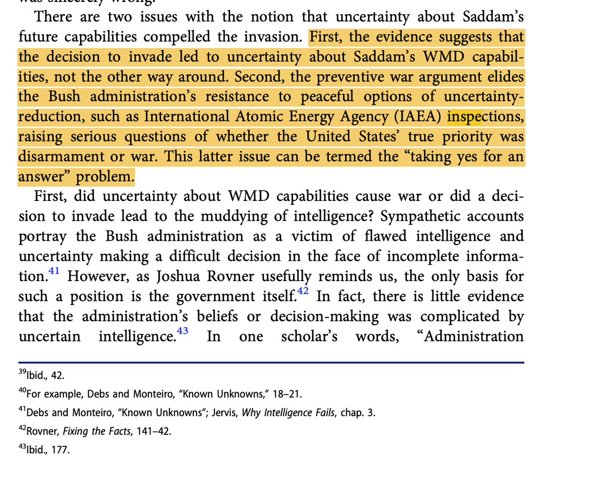 The Bush admin didn't care about inspections though, they wanted war. Almost two decades of debate about WMDs has stopped us from seeing the bigger picture. It would be more excusable if the Bush administration simply screwed up the intelligence, but the truth is much worse. 8/n