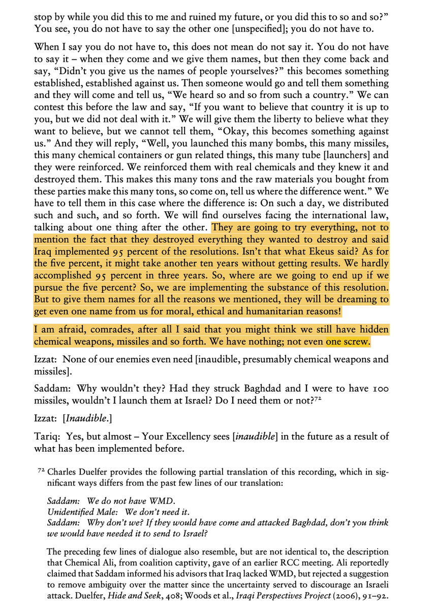Regarding Saddam fooling the rest of his regime, here is the transcript of a recording with other top officials in 1998. He tells them "We have nothing; not even one screw." There was no plan to lie to his generals. 5/n