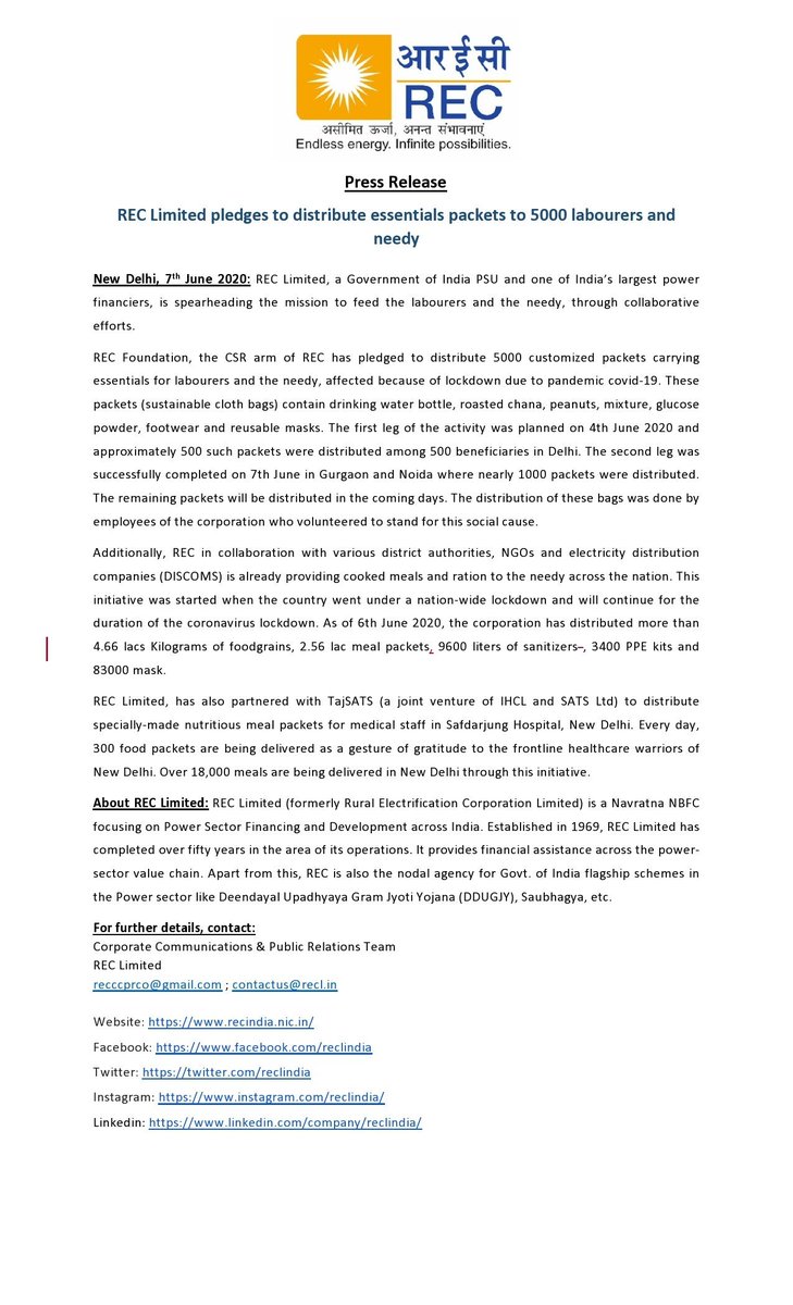 @RECLindia pledged to distribute 5000 customized packets carrying essentials for labourers and the needy, affected because of #lockdown due to #COVID19Pandemic.