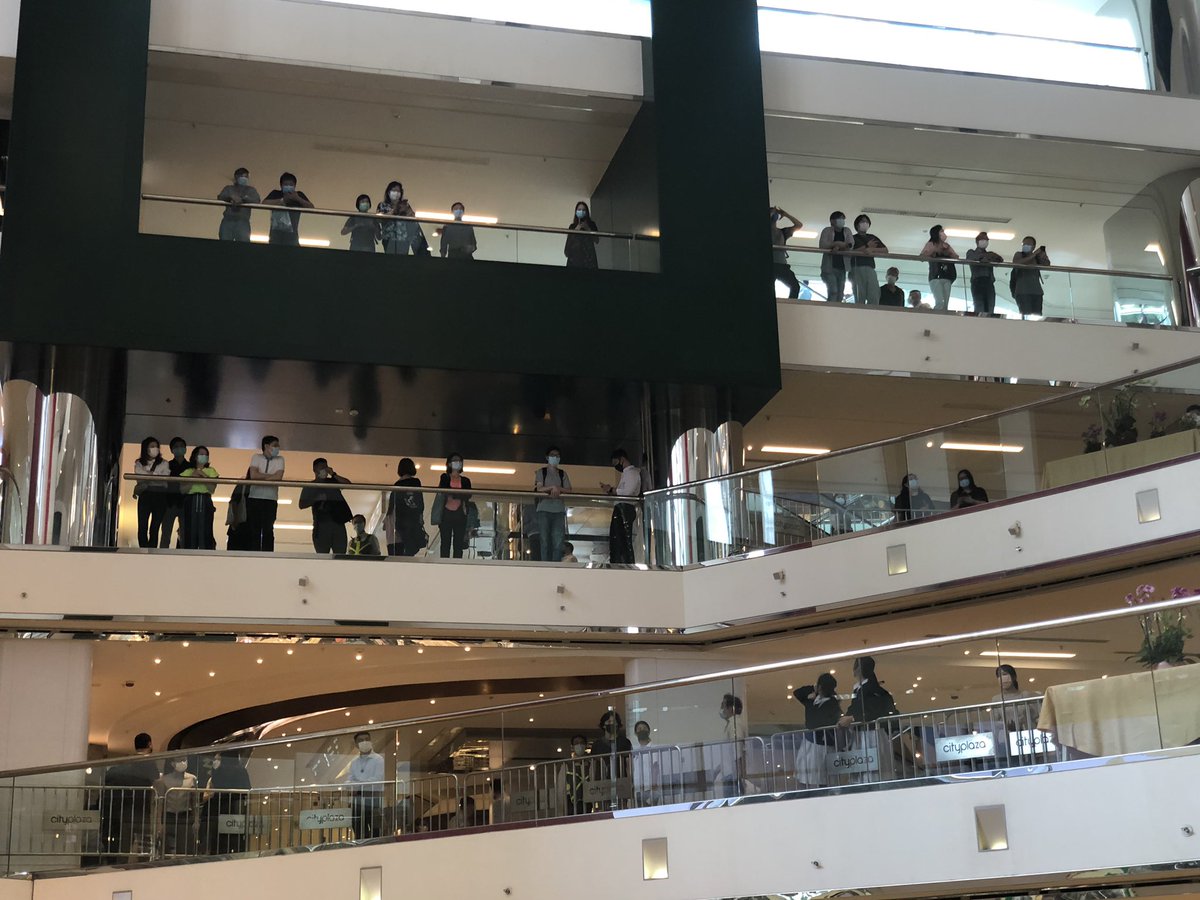 And as quickly as it appeared it has dissipated. Some remain standing by bus stops holding up Apple Daily pages in protest. As has been the case for many protests this year, it’s hard to distinguish between shoppers, bystanders and protesters until they begin chanting.
