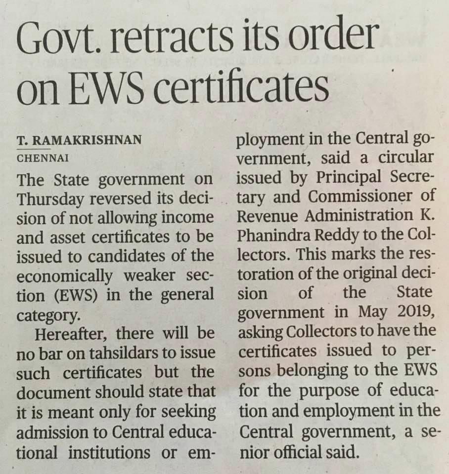 Wonder what's the agenda? Wonder what's happening? TN Govt. absolutely has no idea why it's order was made to stop Tahsildars from issuing EWS certificates. Even in High Court no answers even after 25 days of the said order on why it was issued? Fishy.