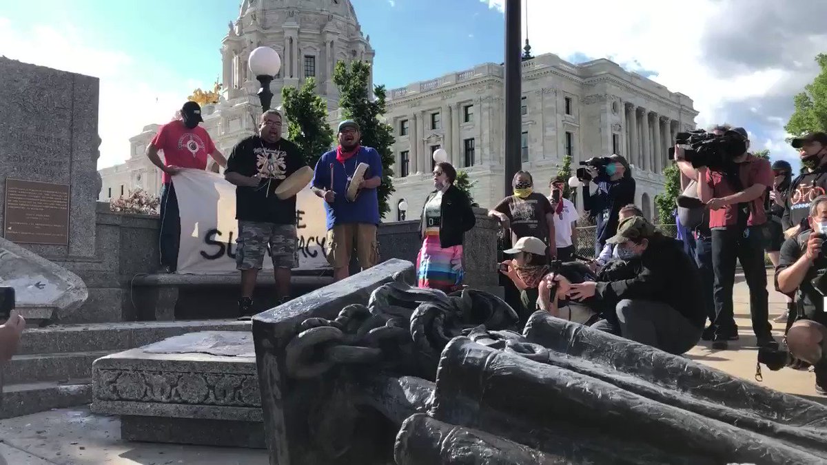 Members of the American Indian Movement are preparing to tear down the statue of Christopher Columbus at the Minnesota State capitol