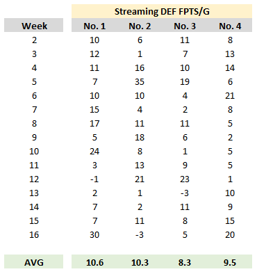 - DEF scoring is very unpredictable on a season-long level, and extremely predictable week-to-week