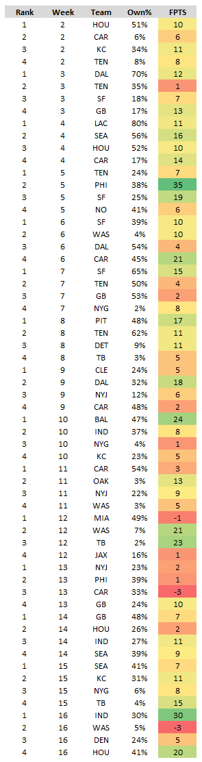 ((There were 3-4 instances early on of me getting cute or lazy and picking a DEF >55% owned. Didn't make a huge difference, but sorry about that.))