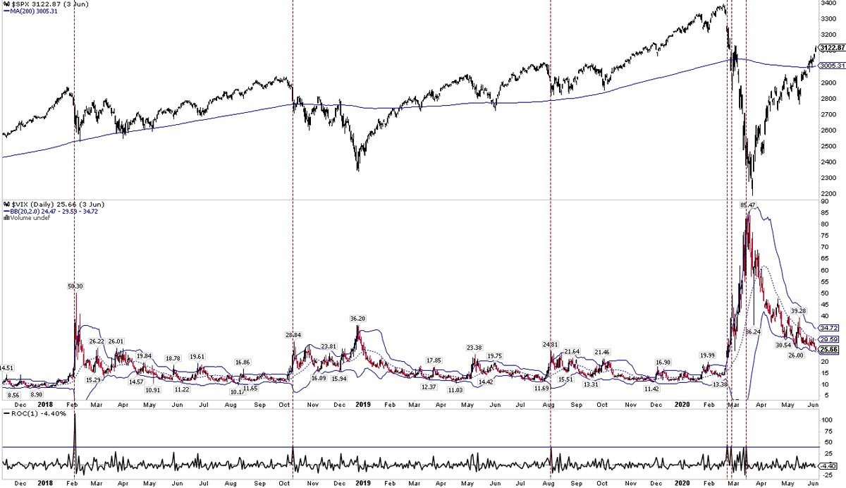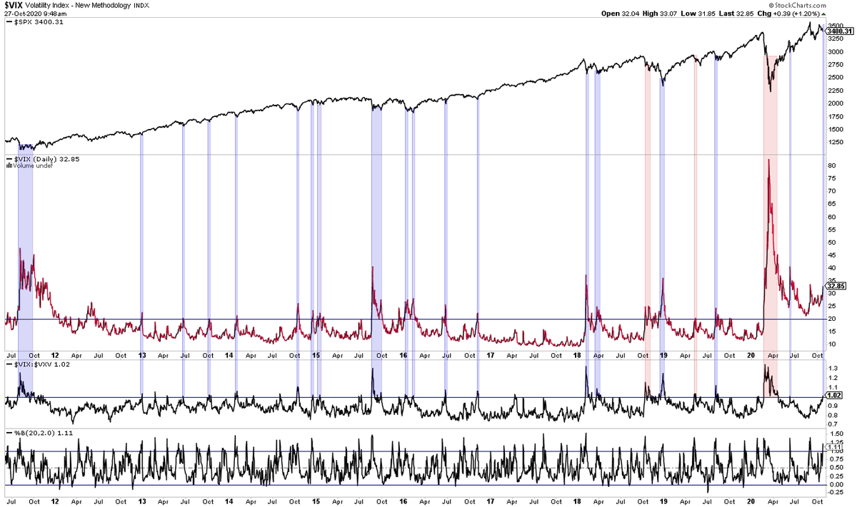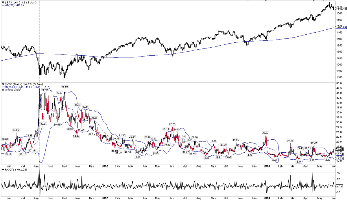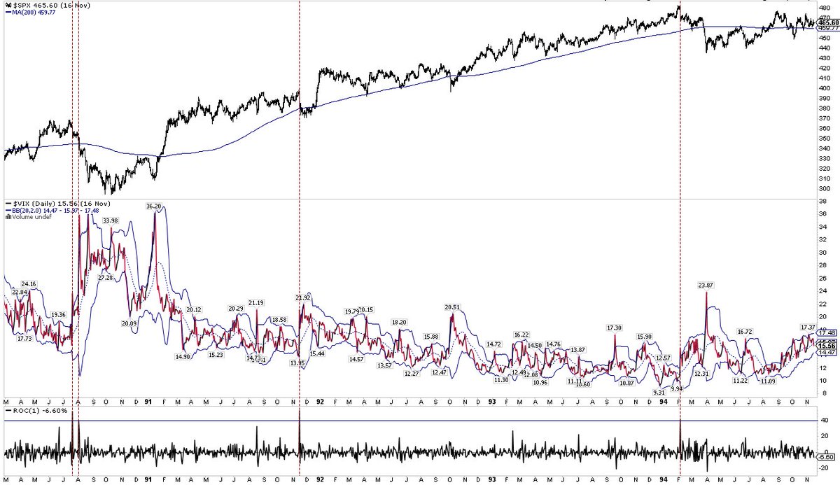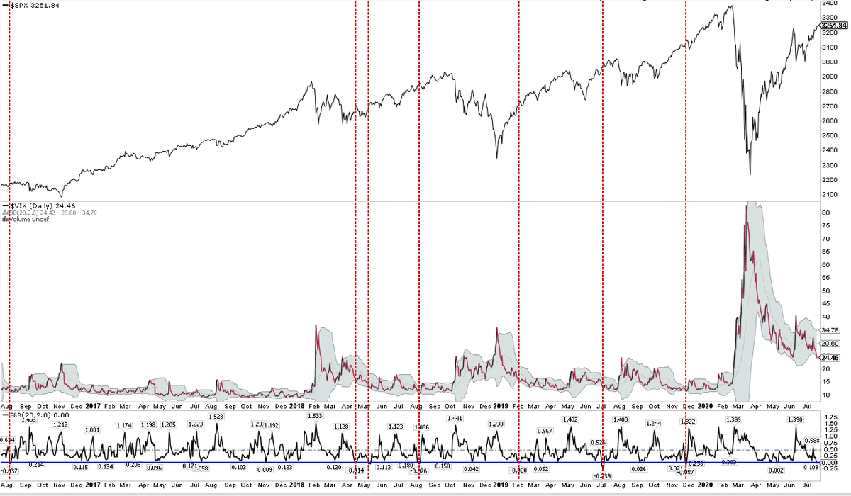 $Vix closed right on the lower Bollinger today. Vertical lines are days it closed below the BB in the last 5 yrs