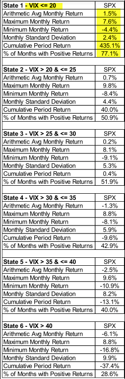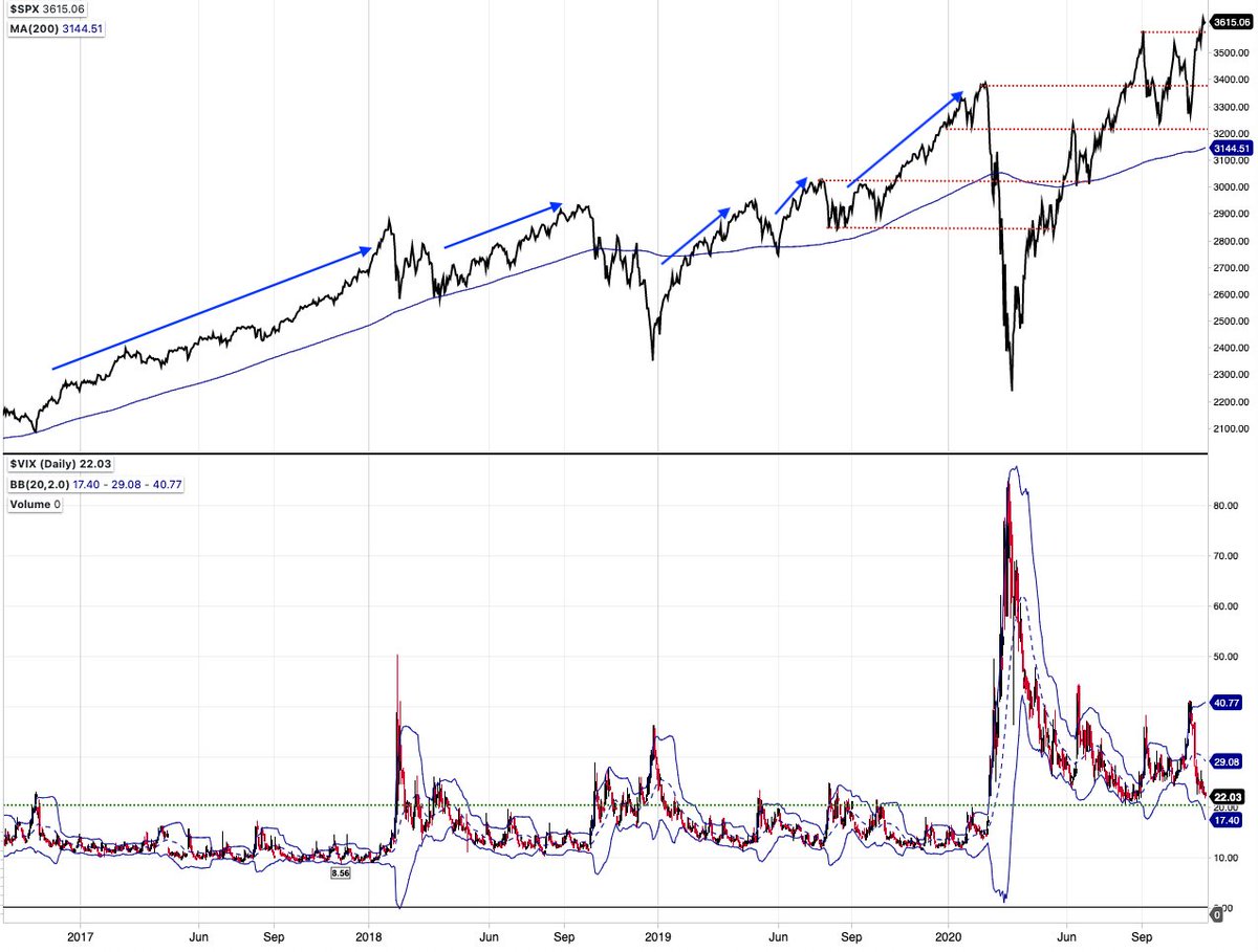 A little dated but this table shows the superior $SPX returns and R/R when $vix <20 versus higher. Hence, the ‘grind higher’ vs ‘things happen’ (std dev)